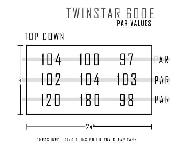 PAR1 strength is something that many LED fixture will easily meet. LEDs in general are very intense so this isn’t the sole metric we should focus on in assessing a planted tank LED. However, it is something that is readily available from Twinstar. Below are the values of the 600E series. The PAR values below here are good enough to light up the vast majority of plants in a planted aquarium.