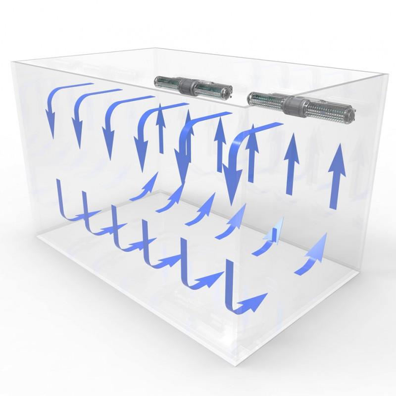 Wavemakers excel in making waves, while waves are spectacular to watch in motion, they are in fact moving the majority of the water vertically up and down, with relatively low horizontal movement, especially near the bottom of the aquarium.