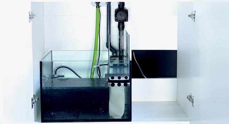 On entering the sump the water passes through a 225 micron mechanical filter bag, before entering the filtration compartment that maintains a constant water height, making it suitable for all skimmers and other reactors.
